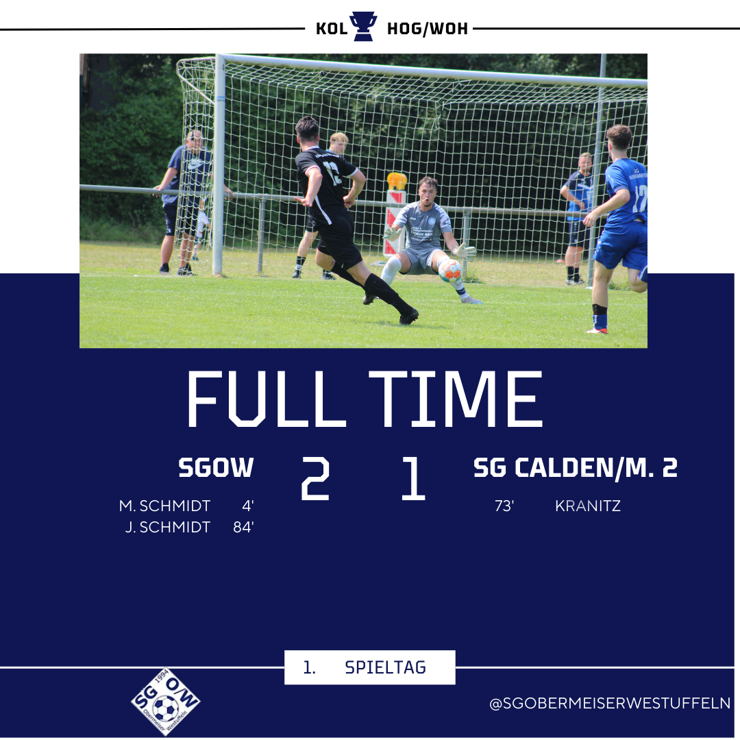 In der zweiten Halbzeit hatte die SG weiterhin mehr vom Spiel. Falsche Entscheidungen oder schlechte Pässe ließen jedoch immer wieder gute Angriffe verpuffen. Diese Fahrlässigkeiten bestrafte Calden nach 70 Minuten mit dem Ausgleichstreffer. Nach einer Ecke wurde zum 1:1 eingeköpft. Das Spielgeschehen fand in der Folge zumeist weiter in der Hälfte der Caldener statt, die gefährlichen Angriffe liefen jedoch allesamt die Gastgeber. Diese wurden die SG-Defensive jedoch kompromisslos verteidigt. Fünf Minuten vor dem Ende schickte David Schmidt Justin Schmidt mit einem schönen Steckpass auf die Reise, welcher den Ball im langen Eck zum 2:1 versenkte. In der Folge drückte Calden auf den Ausgleich, die SG-Defensive stand aber weiterhin gut und ließ keine gefährlichen Aktionen mehr zu.